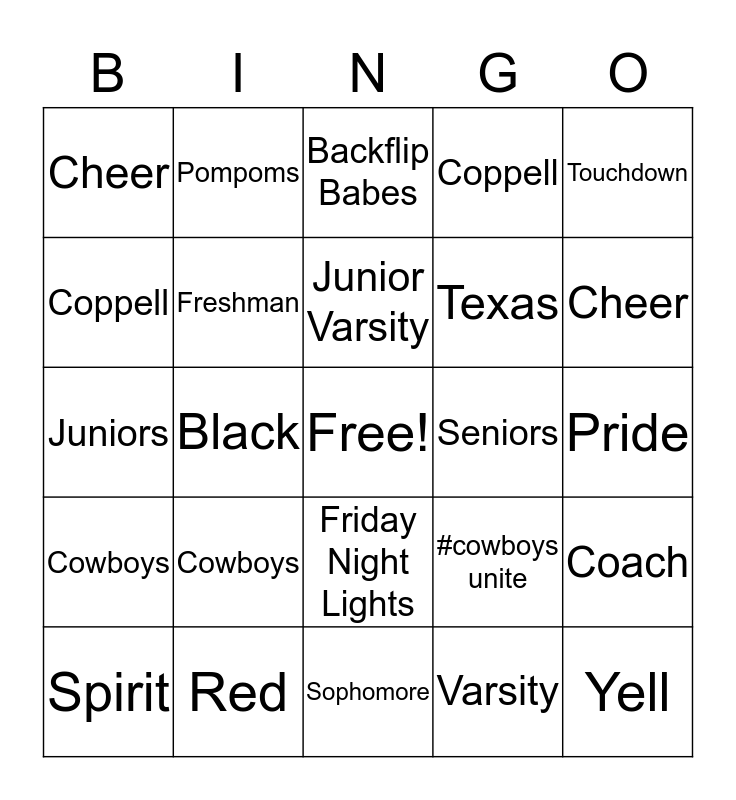 This bingo card has a free space and 24 words: Cowboys, Red, Junior Varsity, Spirit, Touchdown, Cheer, Coppell, Pompoms, Seniors, Friday Night Lights, Texas, Juniors, #cowboys unite, Coach, Freshman, Varsity, Pride, Backflip Babes, Cheer, Black, Yell, Cowboys, Coppell and Sophomore.