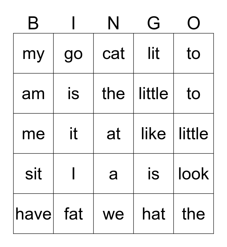 This bingo card has 25 words: I, we, the, have, to, my, am, go, like, a, little, me, is, look, is, the, little, cat, to, it, at, fat, sit, lit and hat.