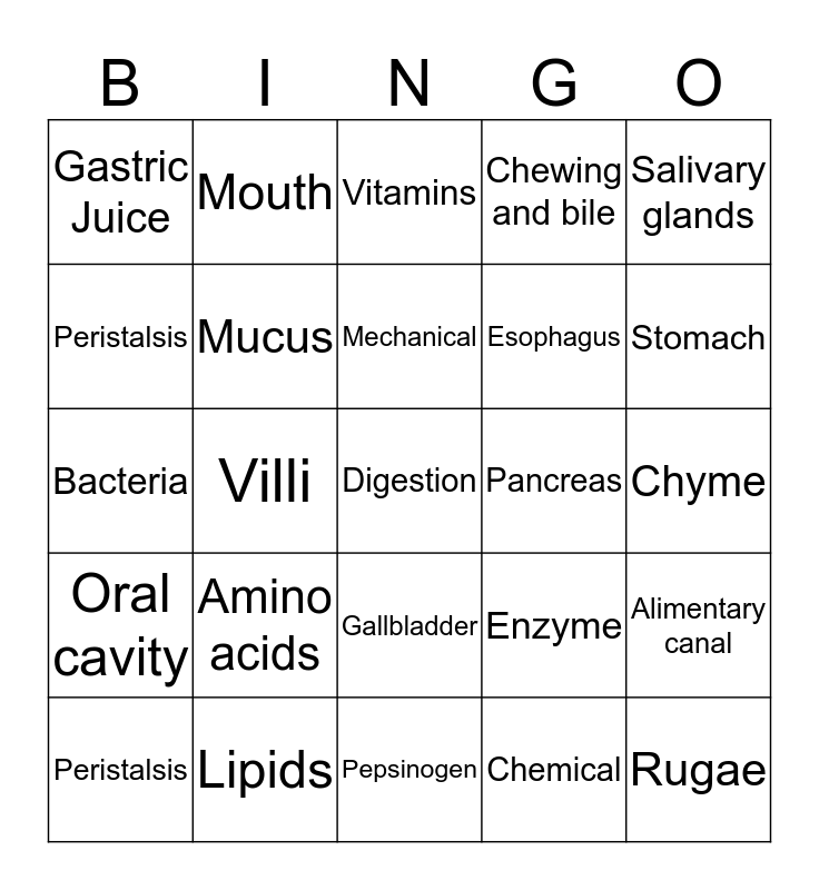 This bingo card has a free space and 24 words: Amino acids, Lipids, Mechanical, Peristalsis, Salivary glands, Gastric Juice, Peristalsis, Mouth, Pancreas, Gallbladder, Esophagus, Bacteria, Enzyme, Alimentary canal, Mucus, Chemical, Chyme, Vitamins, Stomach, Villi, Rugae, Oral cavity, Chewing and bile and Pepsinogen.