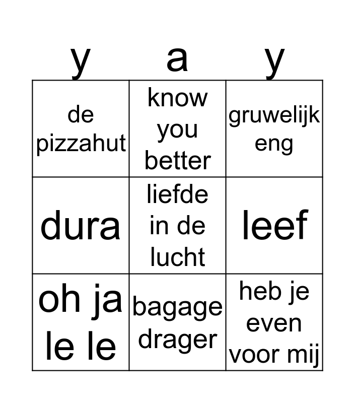 This bingo card has 9 words: oh ja le le, gruwelijk eng, know you better, dura, de pizzahut, leef, liefde in de lucht, heb je even voor mij and bagage drager.