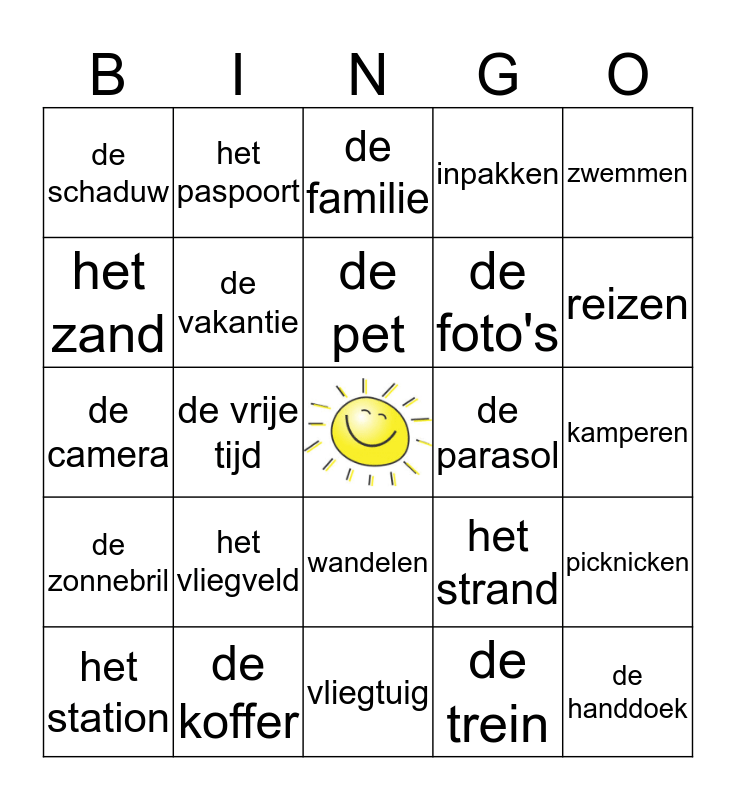 This bingo card has a free space and 24 words: het vliegveld, de koffer, de pet, het station, zwemmen, de schaduw, het zand, het paspoort, de parasol, wandelen, de foto's, de camera, het strand, picknicken, de vakantie, de trein, kamperen, de familie, reizen, de vrije tijd, de handdoek, de zonnebril, inpakken and vliegtuig.