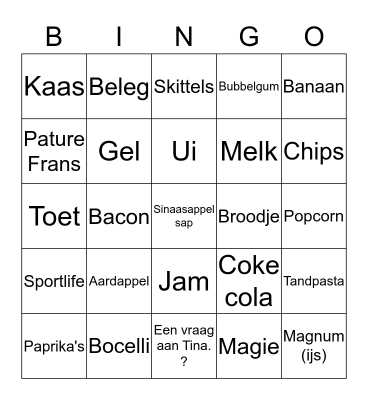 This bingo card has a free space and 24 words: Aardappel, Bocelli, Ui, Paprika's, Banaan, Kaas, Pature Frans, Beleg, Broodje, Jam, Melk, Toet, Coke cola, Tandpasta, Gel, Magie, Popcorn, Skittels, Chips, Bacon, Magnum (ijs), Sportlife, Bubbelgum and Een vraag aan Tina. ?.