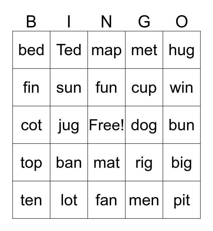 This bingo card has a free space and 24 words: ban, lot, fun, ten, hug, bed, fin, Ted, dog, mat, cup, cot, rig, big, sun, men, bun, map, win, jug, pit, top, met and fan.