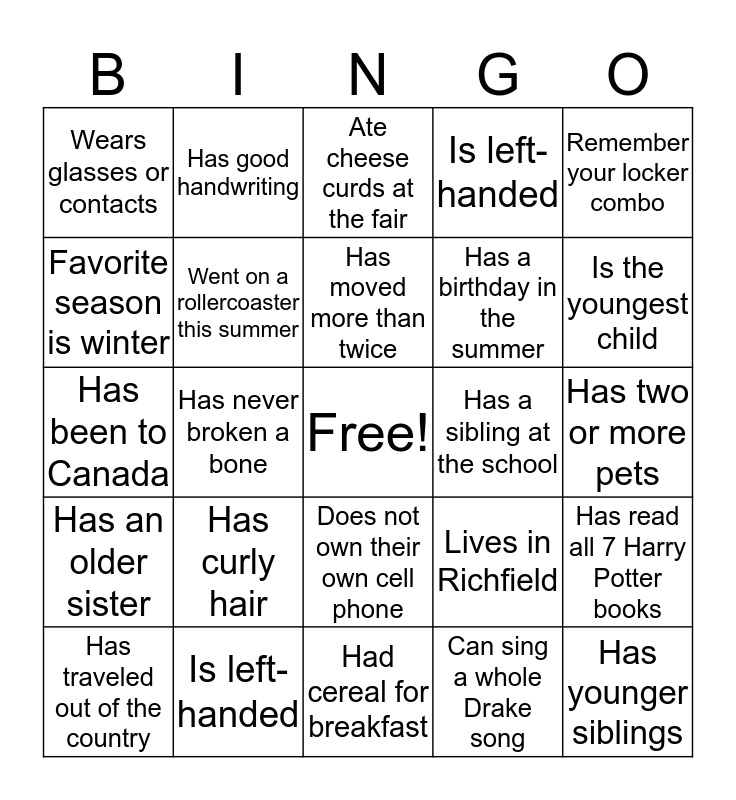 This bingo card has a free space and 24 words: Has curly hair, Is left-handed, Has moved more than twice, Has traveled out of the country, Remember your locker combo, Wears glasses or contacts, Favorite season is winter, Has good handwriting, Has a sibling at the school, Does not own their own cell phone, Has a birthday in the summer, Has been to Canada, Lives in Richfield, Has read all 7 Harry Potter books, Went on a rollercoaster this summer, Can sing a whole Drake song, Has two or more pets, Ate cheese curds at the fair, Is the youngest child, Has never broken a bone, Has younger siblings, Has an older sister, Is left-handed and Had cereal for breakfast.