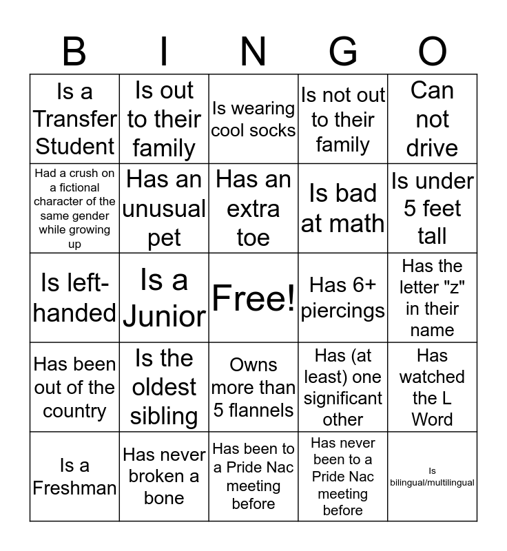 This bingo card has a free space and 29 words: Is a Freshman, Is a Sophomore, Is a Junior, Is a Senior, Is a Transfer Student, Is wearing cool socks, Has an unusual pet, Is the oldest sibling, Has 6+ piercings, Has never broken a bone, Has the letter "z" in their name, Is bilingual/multilingual, Has been to a Pride Nac meeting before, Has never been to a Pride Nac meeting before, Is under 5 feet tall, Is over 6 ft tall, Owns more than 5 flannels, Has been out of the country, Can not drive, Is left-handed, Has (at least) one significant other, Has read the entire Harry Potter series, Is bad at math, Had a crush on a fictional character of the same gender while growing up, Is not out to their family, Is out to their family, Has watched the L Word, Has an extra toe and Wears glasses.
