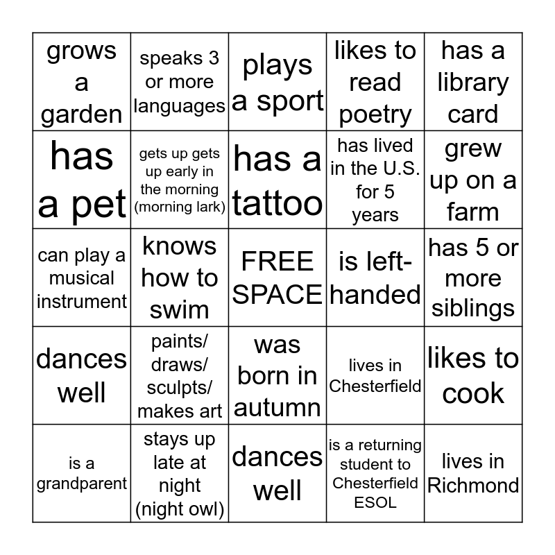 This bingo card has a free space and 24 words: paints/ draws/ sculpts/ makes art, stays up late at night (night owl), has a tattoo, is a grandparent, has a library card, grows a garden, has a pet, speaks 3 or more languages, is left-handed, was born in autumn, has lived in the U.S. for 5 years, can play a musical instrument, lives in Chesterfield, likes to cook, gets up gets up early in the morning (morning lark), is a returning student to Chesterfield ESOL, has 5 or more siblings, plays a sport, grew up on a farm, knows how to swim, lives in Richmond, dances well, likes to read poetry and dances well.