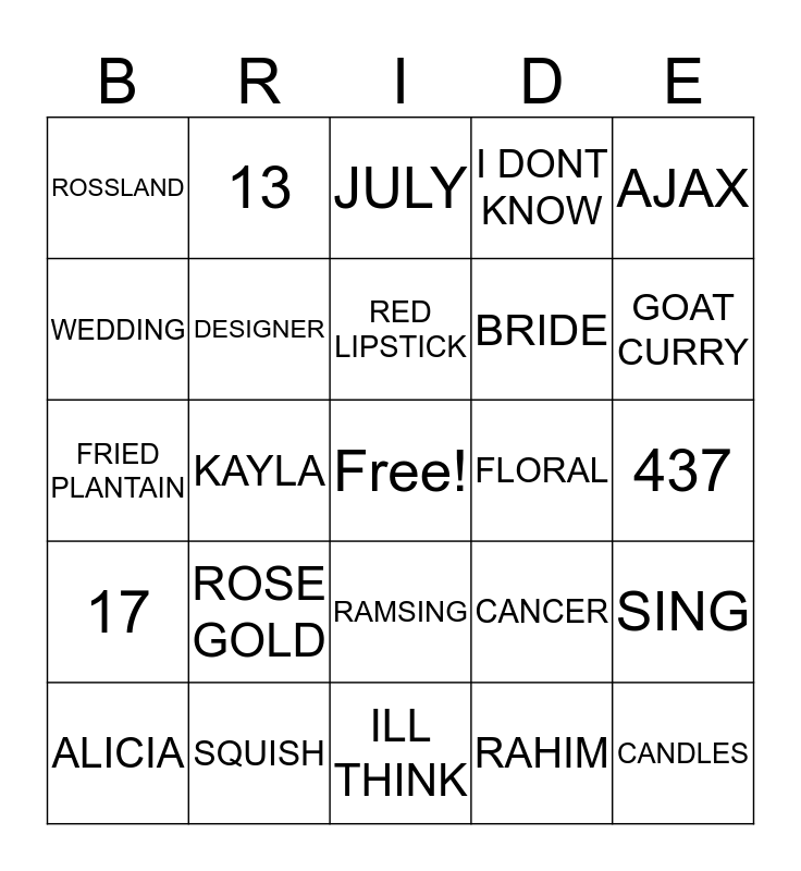 This bingo card has a free space and 24 words: ROSE GOLD, SQUISH, RED LIPSTICK, ALICIA, AJAX, ROSSLAND, WEDDING, 13, FLORAL, RAMSING, BRIDE, FRIED PLANTAIN, CANCER, SING, DESIGNER, RAHIM, 437, JULY, GOAT CURRY, KAYLA, CANDLES, 17, I DONT KNOW and ILL THINK.