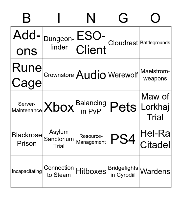 This bingo card has a free space and 24 words: Asylum Sanctorium Trial, Connection to Steam, Audio, Incapacitating, Battlegrounds, Add-ons, Rune Cage, Dungeon-finder, Pets, Resource-Management, Werewolf, Server-Maintenance, PS4, Hel-Ra Citadel, Crownstore, Bridgefights in Cyrodiil, Maw of Lorkhaj Trial, ESO-Client, Maelstrom-weapons, Xbox, Wardens, Blackrose Prison, Cloudrest and Hitboxes.