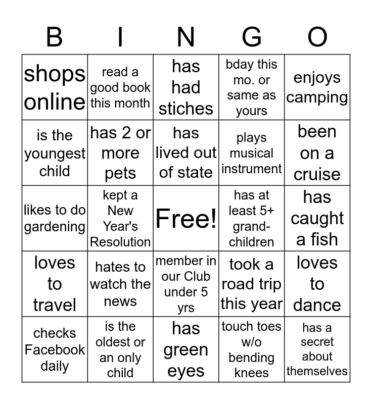 This bingo card has a free space and 24 words: checks Facebook daily, hates to watch the news, has lived out of state, touch toes w/o bending knees, enjoys camping, shops online, read a good book this month, has had stiches, has at least 5+ grand- children, has caught a fish, likes to do gardening, has 2 or more pets, took a road trip this year, loves to dance, is the youngest child, is the oldest or an only child, has green eyes, bday this mo. or same as yours, been on a cruise, loves to travel, kept a New Year's Resolution, member in our Club under 5 yrs, plays musical instrument and has a secret about themselves.