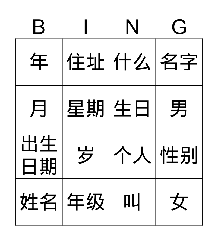 This bingo card has 16 words: 姓名, 年级, 什么, 名字, 月, 住址, 个人, 性别, 年, 星期, 叫, 男, 出生日期, 岁, 生日 and 女.