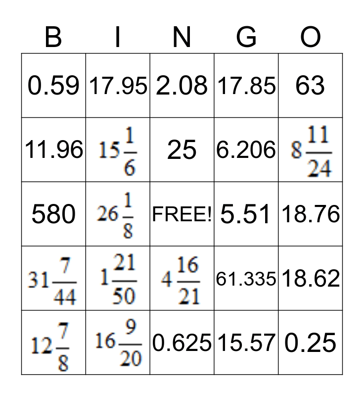 This bingo card has 15 images, a free space and 19 words: 15.57, 63, 17.95, 25, 2.08, 5.51, 580, 61.335, 0.375, 0.59, 18.76, 0.625, 0.25, 17.85, 12, 6.206, 11.96, 18.62 and 10.2.