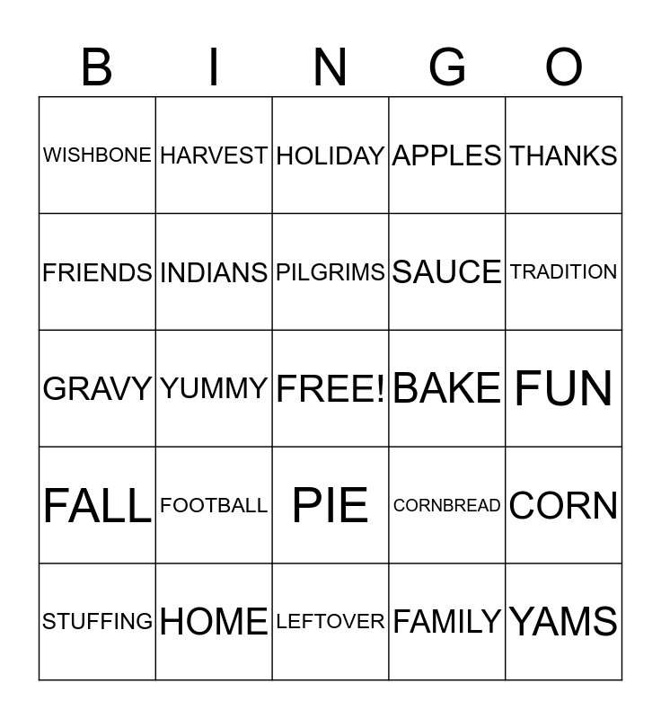 This bingo card has a free space and 28 words: CORN, TURKEY, SAUCE, FAMILY, FRIENDS, HOLIDAY, HARVEST, FALL, BAKE, STUFFING, GRAVY, APPLES, HOME, LEFTOVER, TRADITION, FEAST, FOOTBALL, INDIANS, PILGRIMS, PIE, WISHBONE, NOVEMBER, YAMS, YUMMY, FUN, CORNBREAD, THANKS and AUTUMN.