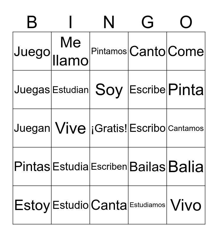 This bingo card has a free space and 24 words: Estudia, Estudio, Soy, Estoy, Come, Juego, Juegas, Me llamo, Escribo, Escriben, Escribe, Juegan, Bailas, Balia, Estudian, Estudiamos, Cantamos, Pintamos, Pinta, Vive, Vivo, Pintas, Canto and Canta.
