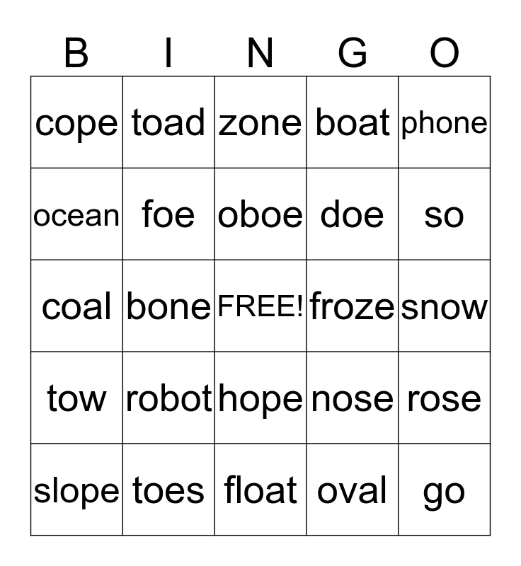 This bingo card has a free space and 24 words: robot, toes, oboe, slope, phone, cope, ocean, toad, froze, hope, doe, coal, nose, rose, foe, oval, snow, zone, so, bone, go, tow, boat and float.