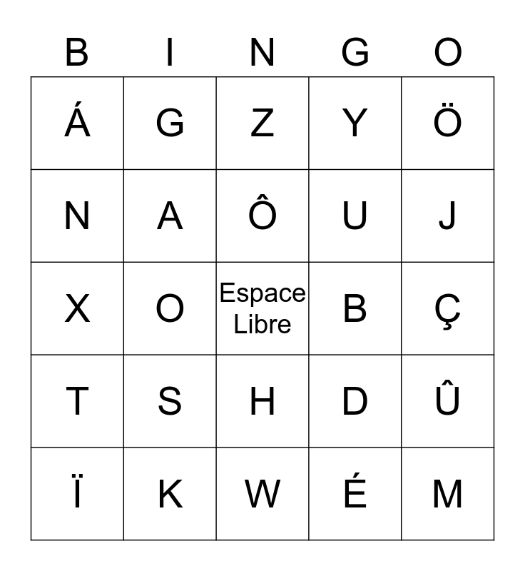 This bingo card has a free space and 24 words: S, K, Ô, Ï, Ö, Á, N, G, B, H, U, X, D, Û, A, É, Ç, Z, J, O, M, T, Y and W.