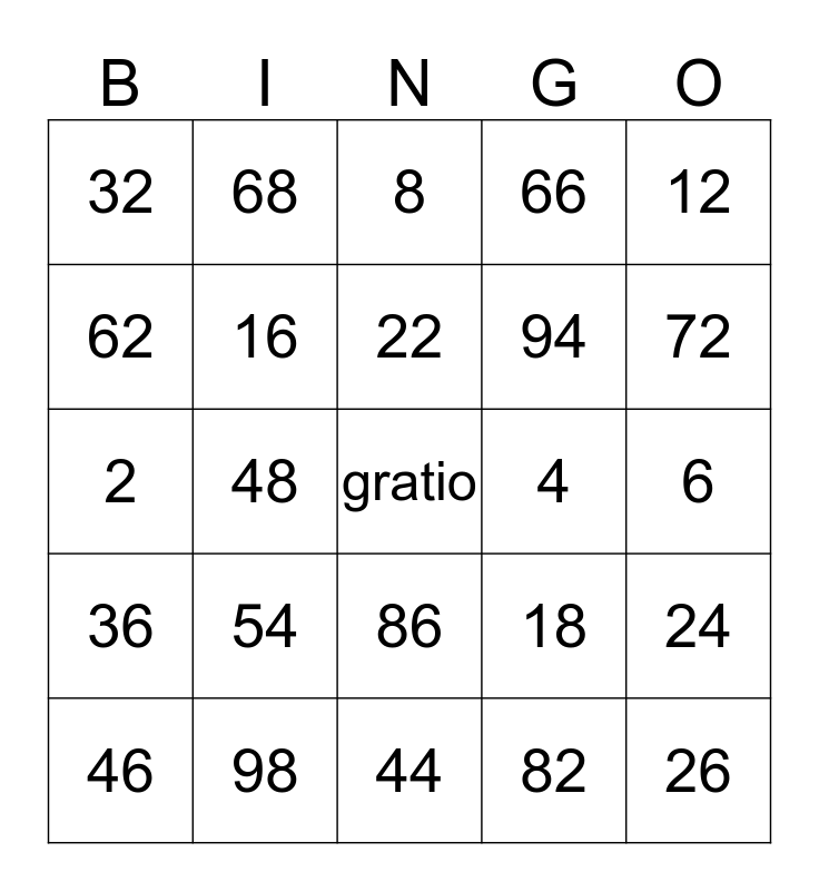This bingo card has a free space and 24 words: 46, 54, 22, 82, 12, 32, 68, 8, 4, 6, 2, 16, 18, 24, 62, 98, 44, 66, 72, 36, 48, 86, 94 and 26.