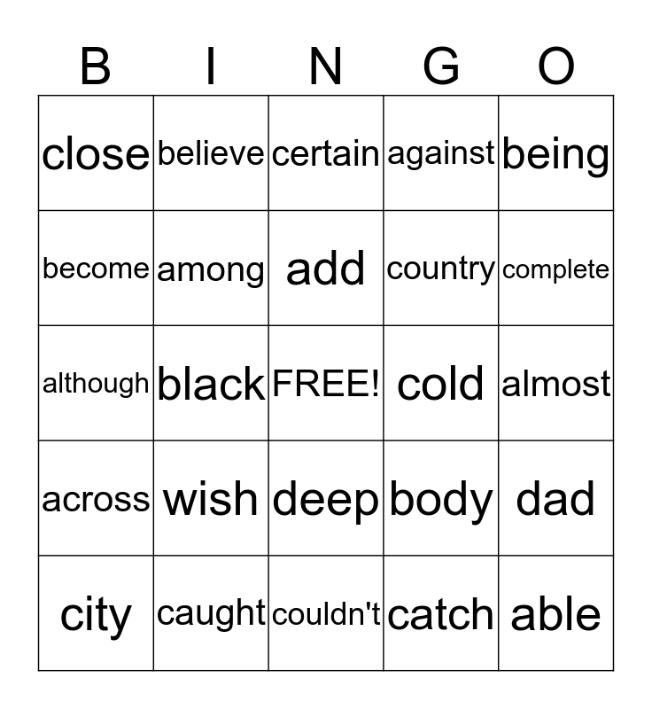 This bingo card has a free space and 24 words: wish, caught, add, city, being, close, become, believe, cold, deep, country, although, body, dad, among, catch, almost, certain, complete, black, able, across, against and couldn't.