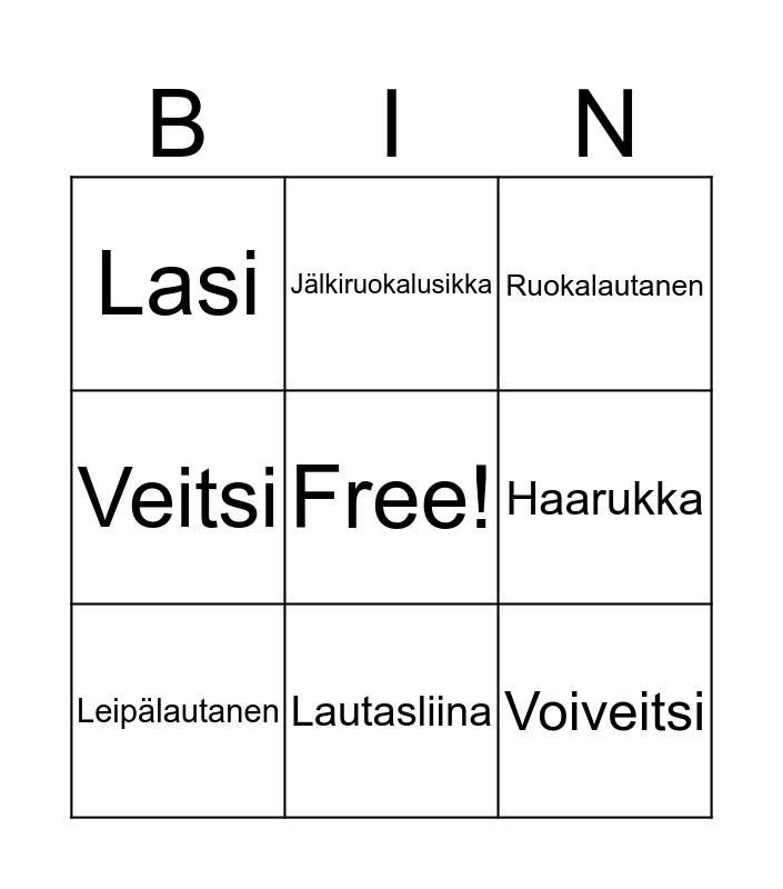 This bingo card has a free space and 8 words: Veitsi, Jälkiruokalusikka, Haarukka, Leipälautanen, Ruokalautanen, Lasi, Lautasliina and Voiveitsi.