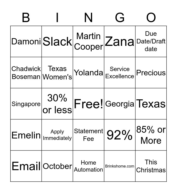 This bingo card has a free space and 24 words: Email, Apply Immediately, Yolanda, Brinkshome.com, Due Date/Draft date, Damoni, Slack, Martin Cooper, Georgia, Texas, Singapore, Texas Women's, 92%, 85% or More, Chadwick Boseman, October, Home Automation, Zana, Precious, Emelin, 30% or less, Statement Fee, Service Excellence and This Christmas.