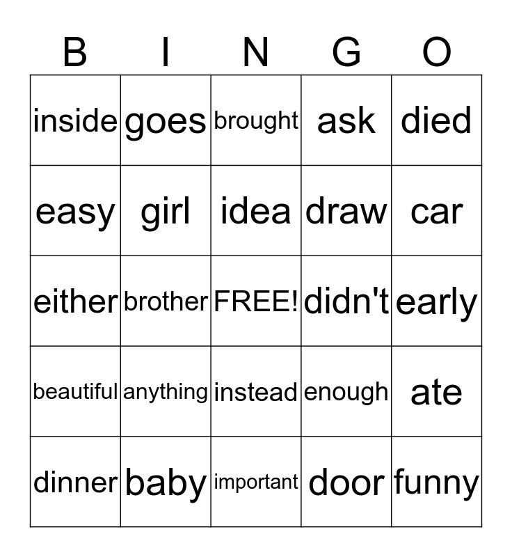 This bingo card has a free space and 24 words: anything, baby, idea, dinner, died, inside, easy, goes, didn't, instead, draw, either, enough, ate, girl, door, early, brought, car, brother, funny, beautiful, ask and important.