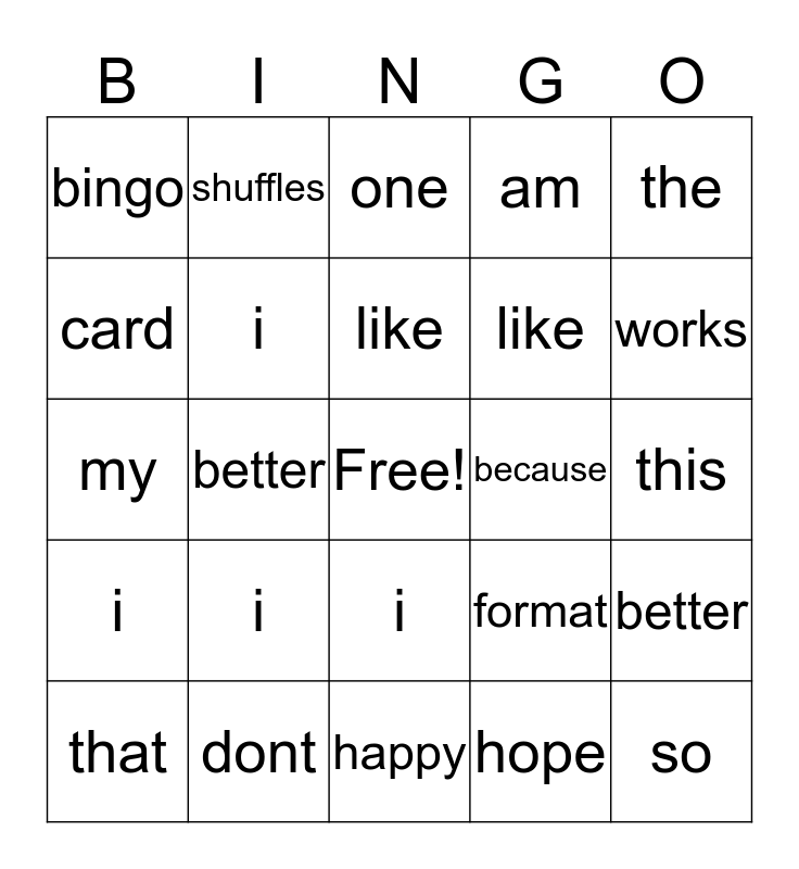 This bingo card has a free space and 24 words: i, dont, like, that, the, bingo, card, shuffles, because, i, like, my, format, better, i, hope, this, one, works, better, so, i, am and happy.