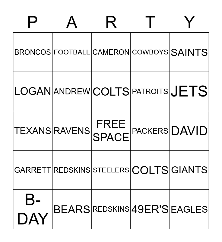 This bingo card has a free space and 24 words: REDSKINS, BEARS, COLTS, B-DAY, SAINTS, BRONCOS, LOGAN, FOOTBALL, PACKERS, STEELERS, PATROITS, TEXANS, COLTS, GIANTS, ANDREW, 49ER'S, DAVID, CAMERON, JETS, RAVENS, EAGLES, GARRETT, COWBOYS and REDSKINS.