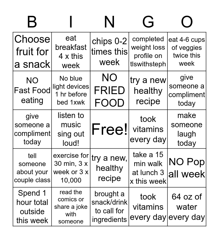 This bingo card has a free space and 24 words: exercise for 30 min, 3 x week or 3 x 10,000, read the comics or share a joke with someone, NO FRIED FOOD, Spend 1 hour total outside this week, eat 4-6 cups of veggies twice this week, Choose fruit for a snack, NO Fast Food eating, eat breakfast 4 x this week, took vitamins every day, try a new, healthy recipe, try a new healthy recipe, give someone a compliment today, take a 15 min walk at lunch 3 x this week, NO Pop all week, No blue light devices 1 hr before bed 1xwk, took vitamins every day, make someone laugh today, chips 0-2 times this week, give someone a compliment today, listen to music sing out loud!, 64 oz of water every day, tell someone about your couple class, completed weight loss profile on tlswithsteph and brought a snack/drink to call for ingredients.