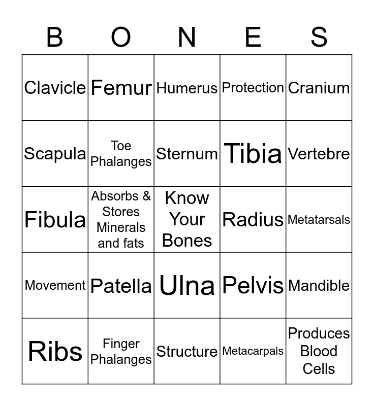 This bingo card has a free space and 24 words: Patella, Finger Phalanges, Sternum, Ribs, Cranium, Clavicle, Scapula, Femur, Radius, Ulna, Tibia, Fibula, Pelvis, Mandible, Toe Phalanges, Metacarpals, Metatarsals, Humerus, Vertebre, Absorbs & Stores Minerals and fats, Produces Blood Cells, Movement, Protection and Structure.