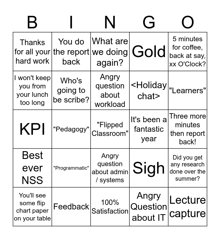 This bingo card has 25 words: "Programmatic", 100% Satisfaction, Angry question about workload, You'll see some flip chart paper on your table, 5 minutes for coffee, back at say, xx O'Clock?, Thanks for all your hard work, I won't keep you from your lunch too long, You do the report back, It's been a fantastic year, Angry question about admin / systems, <Holiday chat>, KPI, Sigh, Did you get any research done over the summer?, Who's going to be scribe?, Lecture capture, Three more minutes then report back!, What are we doing again?, "Learners", "Pedagogy", "Flipped Classroom", Feedback, Best ever NSS, Gold and Angry Question about IT.