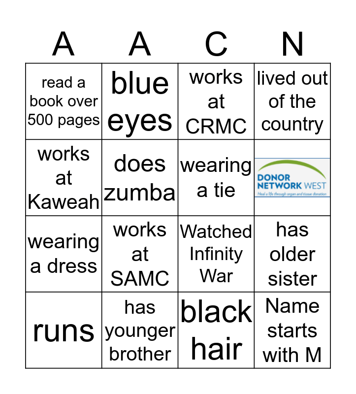 This bingo card has 4 images and 20 words: read a book over 500 pages, blue eyes, wearing a tie, lived out of the country, wearing a dress, has younger brother, black hair, has older sister, plays a sport, goes to art classes, Watched Infinity War, sings, runs, does zumba, does yoga, Name starts with M, works at Kaweah, works at SAMC, works at CRMC and likes 100 degree weather.