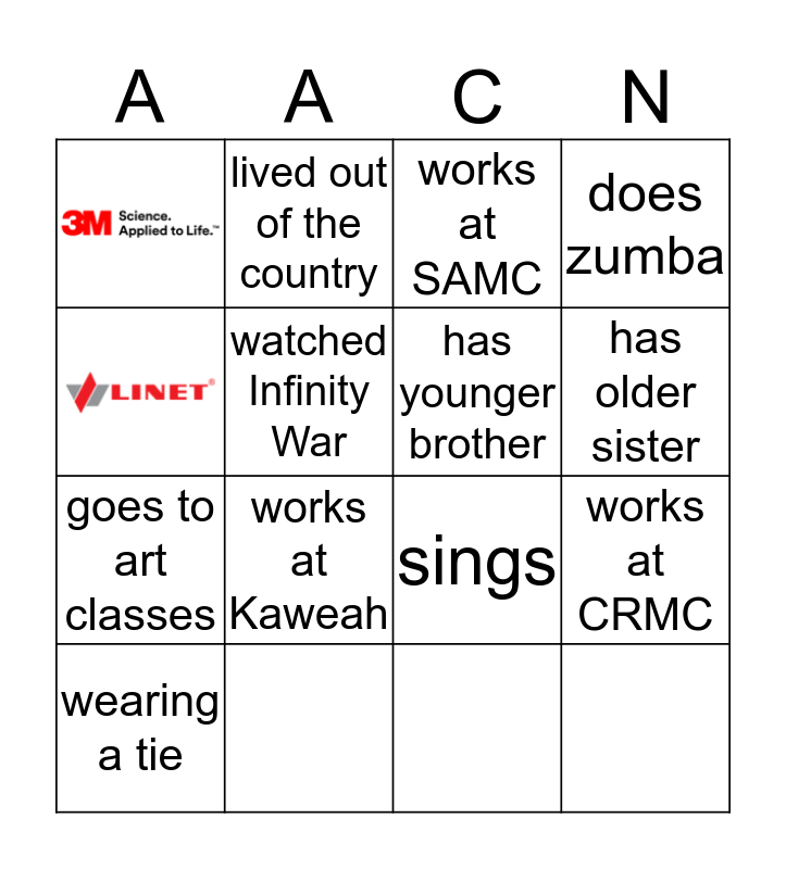 This bingo card has 4 images and 12 words: wearing a tie, lived out of the country, has younger brother, has older sister, goes to art classes, watched Infinity War, sings, does zumba, does yoga, works at Kaweah, works at SAMC and works at CRMC.