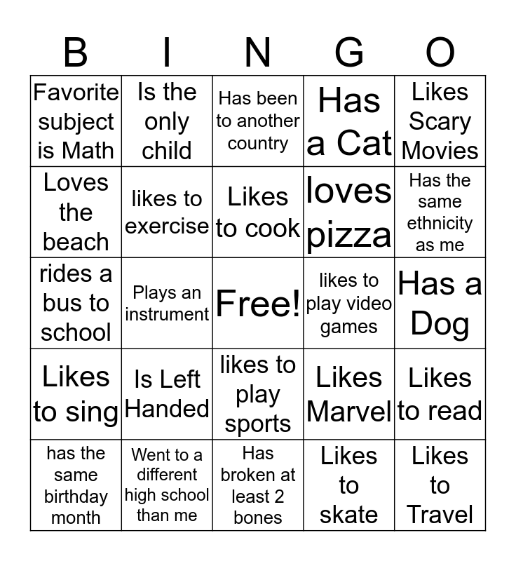 This bingo card has a free space and 24 words: Is Left Handed, Went to a different high school than me, Likes to cook, has the same birthday month, Likes Scary Movies, Favorite subject is Math, Loves the beach, Is the only child, likes to play video games, likes to play sports, loves pizza, rides a bus to school, Likes Marvel, Likes to read, likes to exercise, Likes to skate, Has a Dog, Has been to another country, Has the same ethnicity as me, Plays an instrument, Likes to Travel, Likes to sing, Has a Cat and Has broken at least 2 bones.