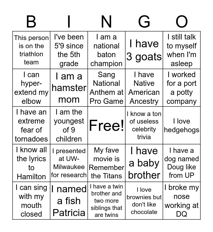 This bingo card has a free space and 24 words: I presented at UW-Milwaukee for research, I named a fish Patricia, Sang National Anthem at Pro Game, I can sing with my mouth closed, I still talk to myself when I'm asleep, This person is on the triathlon team, I can hyper-extend my elbow, I've been 5'9 since the 5th grade, I know a ton of useless celebrity trivia, My fave movie is Remember the Titans, I have Native American Ancestry, I have an extreme fear of tornadoes, I have a baby brother, I have a dog named Doug like from UP, I am a hamster mom, I love brownies but don't like chocolate, I love hedgehogs, I am a national baton champion, I worked for a port a potty company, I am the youngest of 9 children, I broke my nose working at DQ, I know all the lyrics to Hamilton, I have 3 goats and I have a twin brother and two more siblings that are twins.