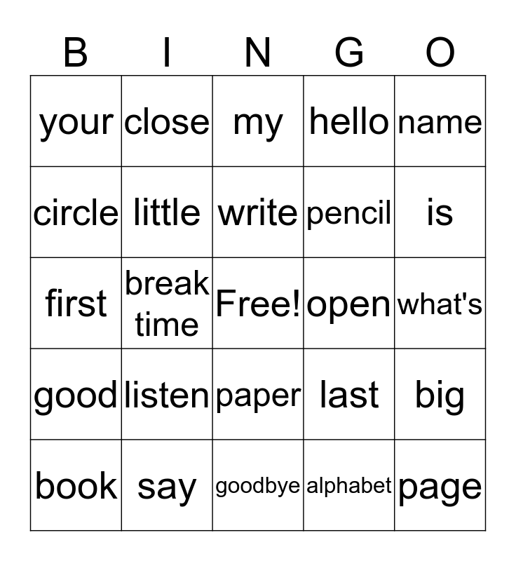 This bingo card has a free space and 24 words: listen, say, write, book, name, your, circle, close, open, paper, pencil, first, last, big, little, alphabet, what's, my, is, break time, page, good, hello and goodbye.