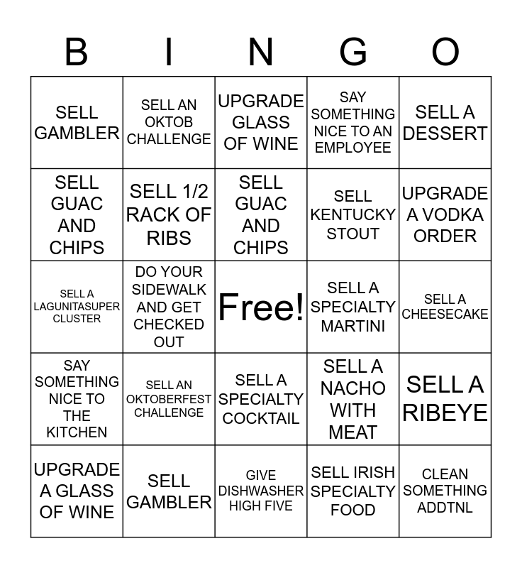 This bingo card has a free space and 24 words: SELL AN OKTOBERFEST CHALLENGE, SELL GAMBLER, SELL GUAC AND CHIPS, UPGRADE A GLASS OF WINE, SELL A DESSERT, SELL GAMBLER, SELL GUAC AND CHIPS, SELL AN OKTOB CHALLENGE, SELL A SPECIALTY MARTINI, SELL A SPECIALTY COCKTAIL, SELL KENTUCKY STOUT, SELL A LAGUNITASUPER CLUSTER, SELL A NACHO WITH MEAT, SELL A RIBEYE, SELL 1/2 RACK OF RIBS, SELL IRISH SPECIALTY FOOD, SELL A CHEESECAKE, UPGRADE GLASS OF WINE, UPGRADE A VODKA ORDER, DO YOUR SIDEWALK AND GET CHECKED OUT, CLEAN SOMETHING ADDTNL, SAY SOMETHING NICE TO THE KITCHEN, SAY SOMETHING NICE TO AN EMPLOYEE and GIVE DISHWASHER HIGH FIVE.