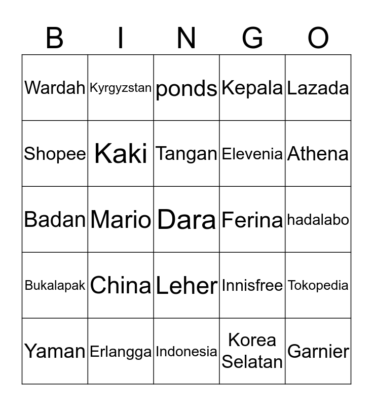 This bingo card has a free space and 24 words: China, Erlangga, Tangan, Yaman, Lazada, Wardah, Shopee, Kyrgyzstan, Ferina, Leher, Elevenia, Badan, Innisfree, Tokopedia, Kaki, Korea Selatan, hadalabo, ponds, Athena, Mario, Garnier, Bukalapak, Kepala and Indonesia.