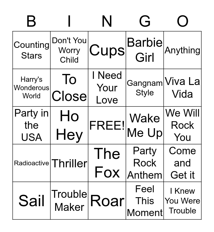 This bingo card has a free space and 26 words: The Fox, Feel This Moment, I Need Your Love, Trouble Maker, Anything, Counting Stars, Harry's Wonderous World, Don't You Worry Child, We Will Rock You, Party Rock Anthem, Gangnam Style, Party in the USA, Come and Get it, Sail, Ho Hey, The Final Countdown, Barbie Girl, Radioactive, Cups, I Knew You Were Trouble, Viva La Vida, Roar, Wake Me Up, Thriller, To Close and Good Time.