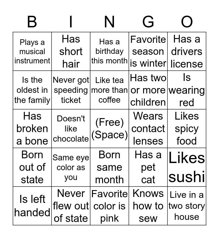 This bingo card has a free space and 24 words: Same eye color as you, Never flew out of state, Like tea more than coffee, Is left handed, Has a drivers license, Plays a musical instrument, Is the oldest in the family, Has short hair, Wears contact lenses, Born same month, Has two or more children, Has broken a bone, Has a pet cat, Likes sushi, Never got speeding ticket, Knows how to sew, Likes spicy food, Has a birthday this month, Is wearing red, Doesn't like chocolate, Live in a two story house, Born out of state, Favorite season is winter and Favorite color is pink.