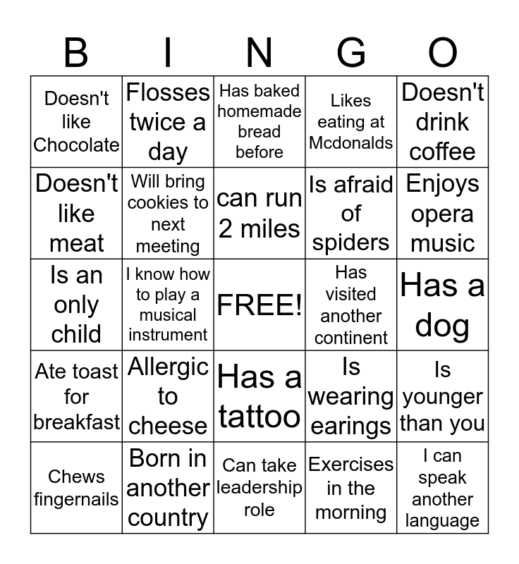 This bingo card has a free space and 24 words: Allergic to cheese, Born in another country, can run 2 miles, Chews fingernails, Doesn't drink coffee, Doesn't like Chocolate, Doesn't like meat, Flosses twice a day, Has visited another continent, Has a tattoo, Is afraid of spiders, Is an only child, Is wearing earings, Is younger than you, Will bring cookies to next meeting, Exercises in the morning, Has a dog, Has baked homemade bread before, Enjoys opera music, I know how to play a musical instrument, I can speak another language, Ate toast for breakfast, Likes eating at Mcdonalds and Can take leadership role.