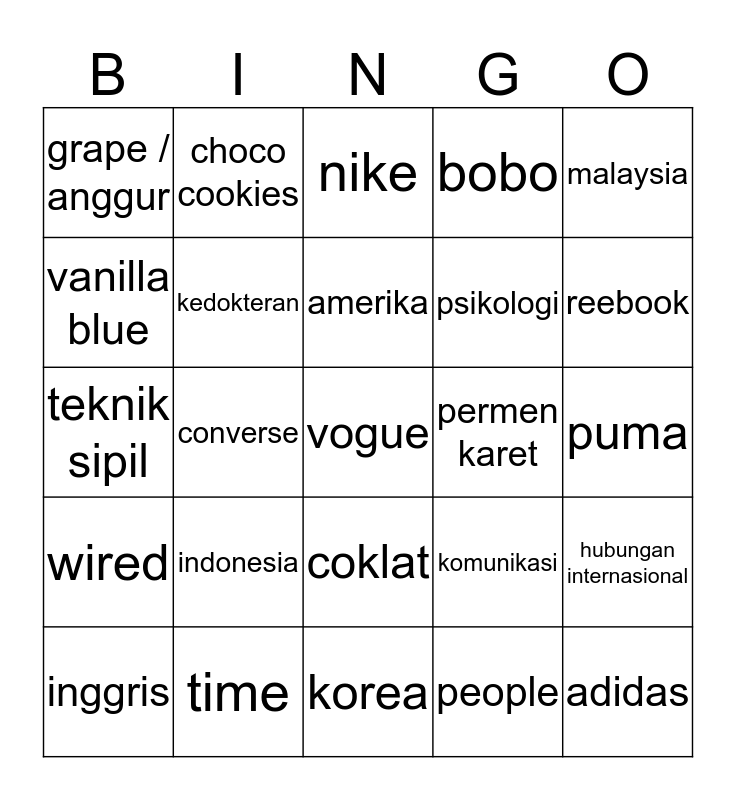 This bingo card has 25 words: indonesia, korea, amerika, inggris, malaysia, grape / anggur, vanilla blue, choco cookies, permen karet, coklat, psikologi, teknik sipil, komunikasi, hubungan internasional, kedokteran, adidas, puma, nike, reebook, converse, vogue, time, wired, bobo and people.