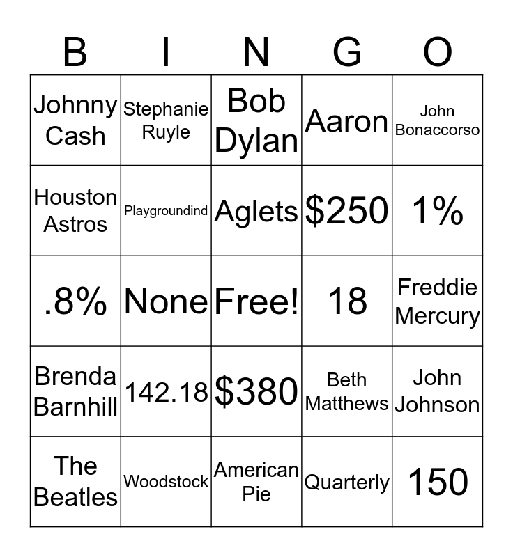 This bingo card has a free space and 25 words: 142.18, American Pie, Aglets, The Beatles, John Bonaccorso, Johnny Cash, Houston Astros, Stephanie Ruyle, 18, $380, $250, .8%, Beth Matthews, John Johnson, Playgroundind, Concur, Freddie Mercury, Bob Dylan, 1%, None, 150, Woodstock, Brenda Barnhill, Aaron and Quarterly.