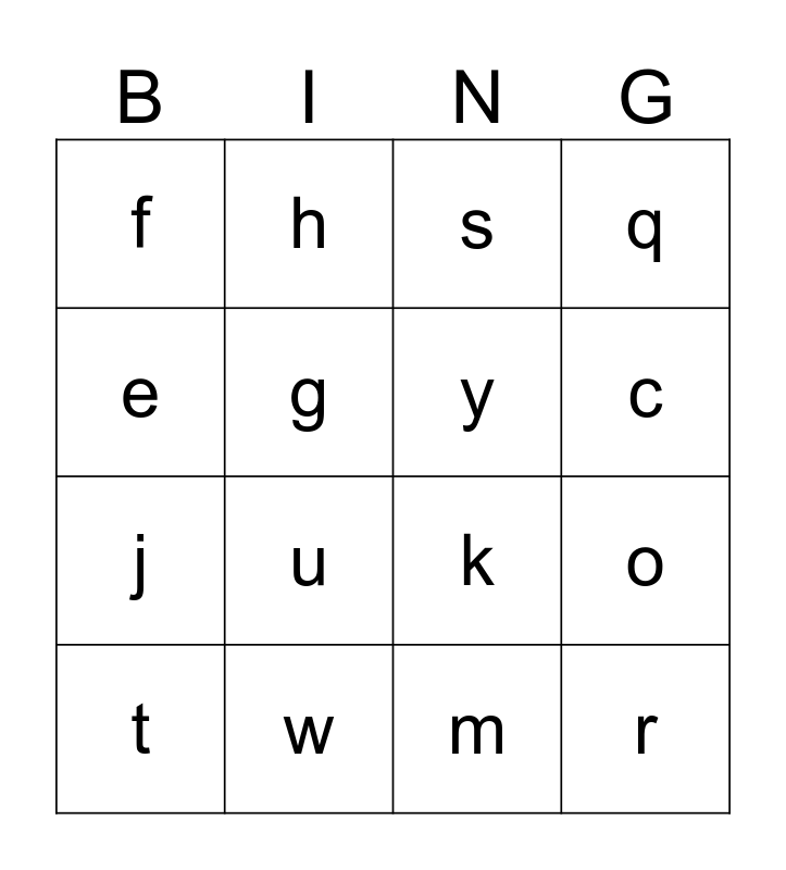This bingo card has 26 words: a, b, c, d, e, f, g, h, m, i, j, k, l, n, o, p, q, r, s, t, u, v, w, x, y and z.