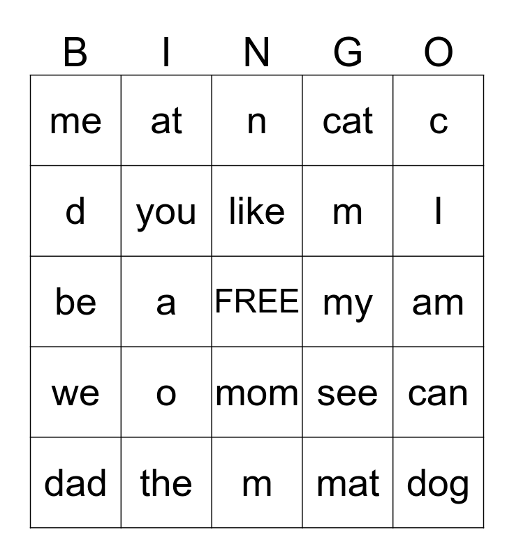 This bingo card has a free space and 24 words: o, the, like, dad, c, me, d, at, my, mom, m, be, see, can, you, mat, am, n, I, a, dog, we, cat and m.
