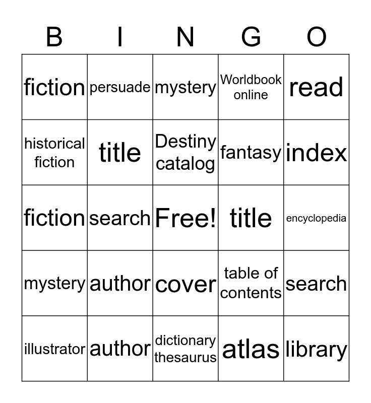 ⚠ This card has duplicate items: library (2), fiction (2), nonfiction (2), title (2), author (2), cover (2), illustrator (2), read (2), mystery (2), search (2)