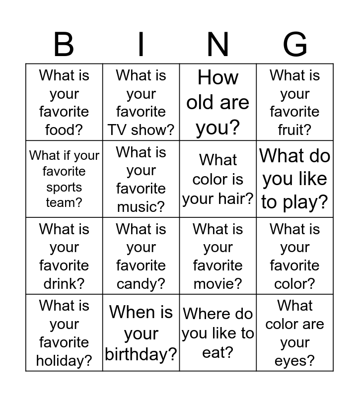 This bingo card has 16 words: When is your birthday?, What is your favorite color?, How old are you?, What is your favorite food?, What is your favorite drink?, What is your favorite TV show?, What is your favorite movie?, Where do you like to eat?, What if your favorite sports team?, What is your favorite music?, What is your favorite holiday?, What is your favorite fruit?, What is your favorite candy?, What do you like to play?, What color is your hair? and What color are your eyes?.
