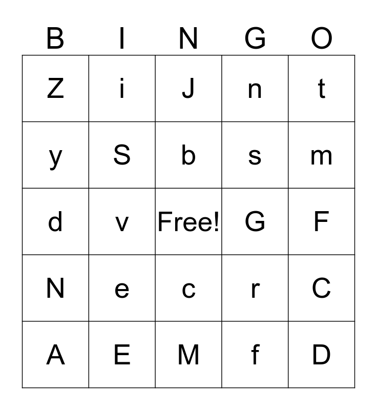 This bingo card has a free space and 24 words: e, E, b, A, t, Z, y, i, G, c, s, d, r, C, S, f, F, J, m, v, D, N, n and M.