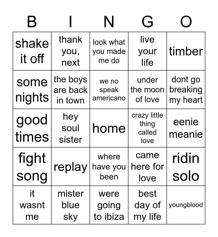 This bingo card has 41 words: thats what friends are for, good times, girl on fire, the boys are back in town, mister blue sky, where have you been, we no speak americano, man i feel like a woman, timber, fight song, hey soul sister, live your life, home, eenie meanie, crazy little thing called love, replay, YMCA, shake it off, hangin on the telephone, look what you made me do, ridin solo, youngblood, were going to ibiza, under the moon of love, price tag, blank space, best day of my life, aint no mountain high enough, dont go breaking my heart, jump to the beat, let you love me, thank you, next, it wasnt me, boss, came here for love, some nights, fairytale of new york, we found love, party all night, super freak and tweedle dee.