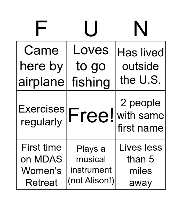 This bingo card has a free space and 8 words: 2 people with same first name, Has lived outside the U.S., Loves to go fishing, First time on MDAS Women's Retreat, Came here by airplane, Lives less than 5 miles away, Exercises regularly and Plays a musical instrument (not Alison!).