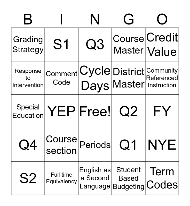 This bingo card has a free space and 24 words: Course section, Full time Equivalency, Cycle Days, S2, Credit Value, Grading Strategy, Response to Intervention, S1, Q2, Periods, District Master, Special Education, Q1, NYE, Comment Code, Student Based Budgeting, FY, Q3, Community Referenced Instruction, YEP, Term Codes, Q4, Course Master and English as a Second Language.