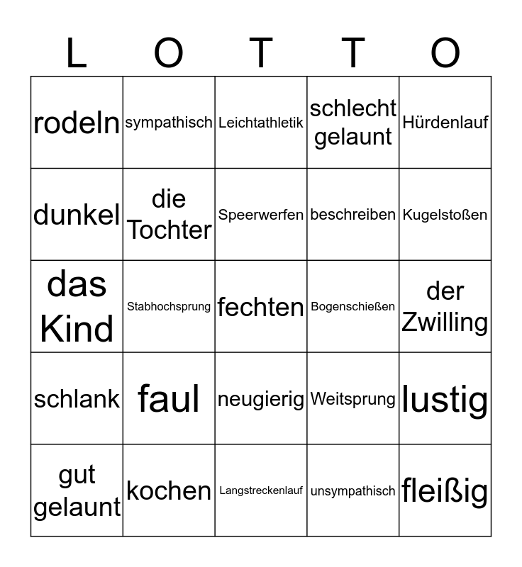 This bingo card has 25 words: faul, Langstreckenlauf, Speerwerfen, gut gelaunt, Hürdenlauf, rodeln, dunkel, sympathisch, Bogenschießen, neugierig, beschreiben, das Kind, Weitsprung, lustig, die Tochter, fleißig, der Zwilling, Leichtathletik, Kugelstoßen, Stabhochsprung, fechten, kochen, schlank, schlecht gelaunt and unsympathisch.